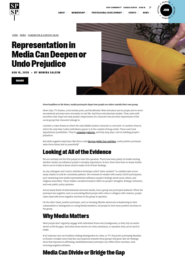 November 3, 2025 – SPSP News Coverage: Representation in Media Can Deepen or Undo Prejudice